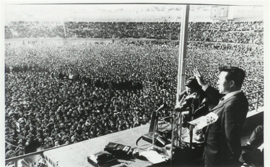 ▲ 효창공원 연설(1969년) 김대중 의원이 1969년 효창공원에서 박정희의 3선개헌을 규탄하는 연설을 하고 있다. 연설 제목은 '3선개헌은 국체의 변형이다'였다. |