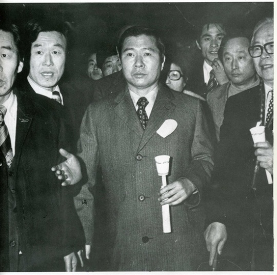 ▲ 김대중의 촛불시위 1976년 3월 1일 명동성당에서 3.1민주구국선언을 발표하고 촛불시위를 하고 있다. 이 사건으로 구속된 김대중은 2년 10개월 동안 감옥에 갇힌다. |