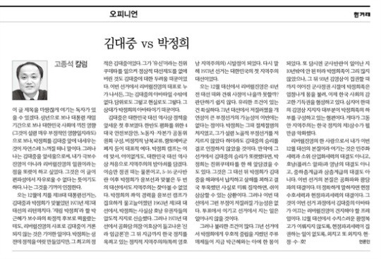 ▲ 고종석 칼럼 "김대중 vs 박정희" 한겨레 신문 2012.8.13일자 신문. 이 칼럼은 "12월 대선은 김대중과 박정희의 리턴매치이며, 공화파와 왕당파의 대결"이라고 주장하고 있다. |