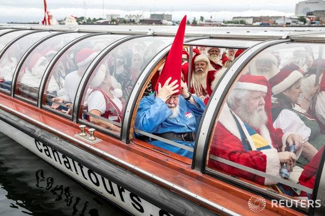산타클로스로 분장한 사람들이 덴마크 코펜하겐의 놀이 공원에서 매년 여름 열리는 세계 산타클로스 회의에 참여해 운하 투어를 하고 있다. / 덴마크 코펜하겐